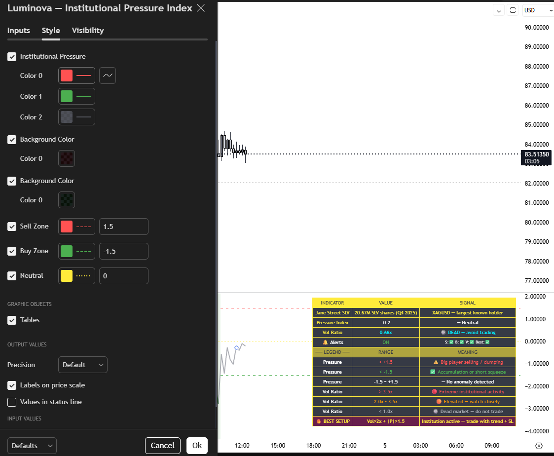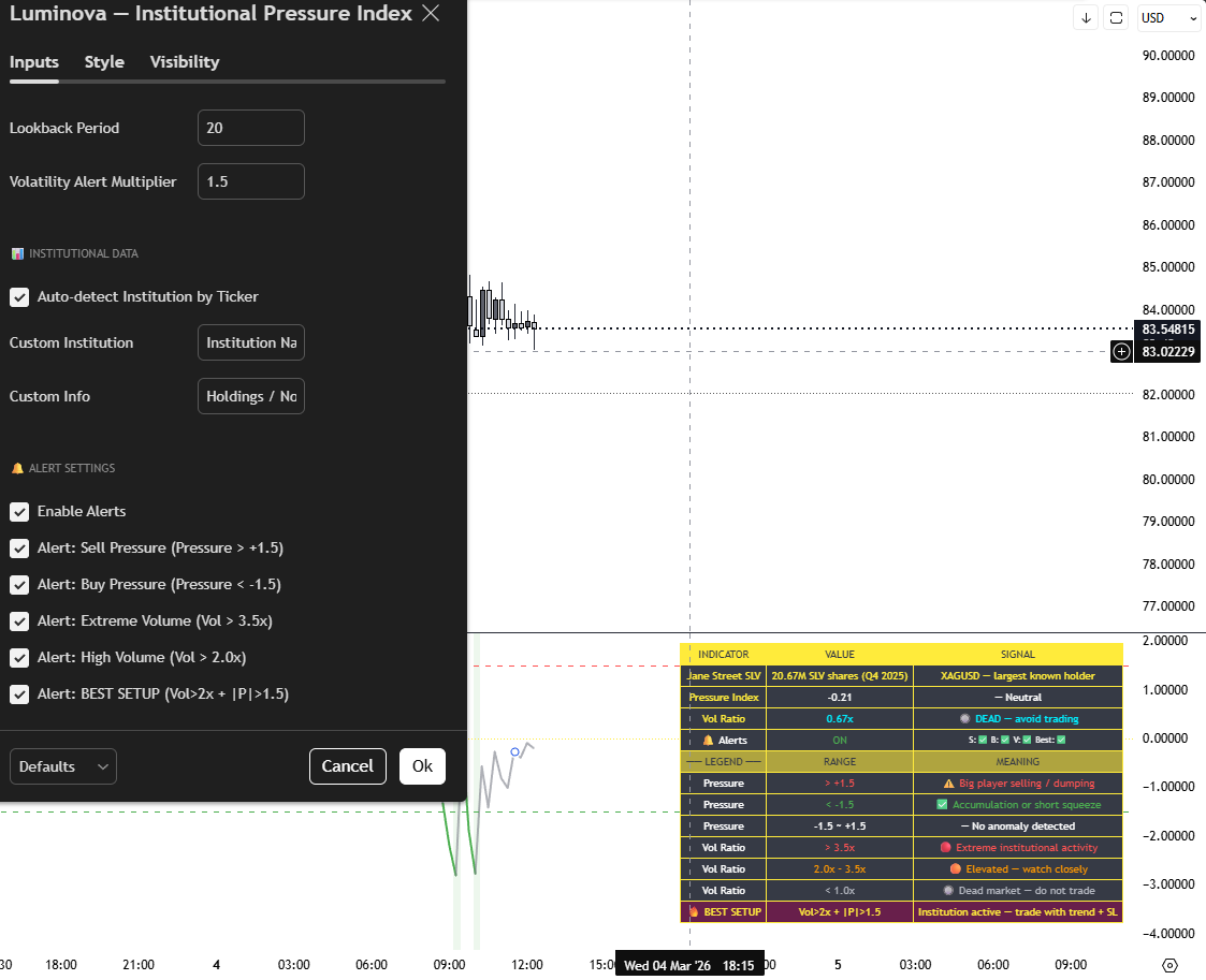 Luminova Institutional Pressure Index is an invite-only Pine v5 indicator that detects real institutional activity by combining ATR Z-score, Volume Ratio and price direction into one clear Pressure line. Auto-detects the largest known holder for your instrument (Silver, Gold, BTC, Forex, Indices), fires a 🔥 BEST SETUP signal when volume and pressure align, and includes 5 configurable alerts. Lifetime access after one-time purchase.