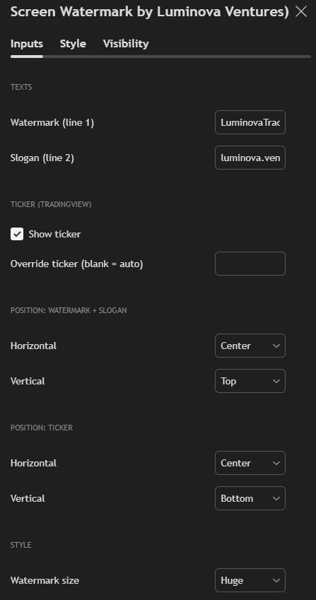 Screen Watermark by Luminova Ventures is an invite-only Pine v5 utility that adds pro-level custom branding to any TradingView chart screen. Place your brand name, slogan & ticker anywhere (9 positions) with full control over size (Tiny-Huge), colors & transparency (0-100%) – perfect for screenshots, videos & client reports without Photoshop. Lifetime access after one-time purchase.